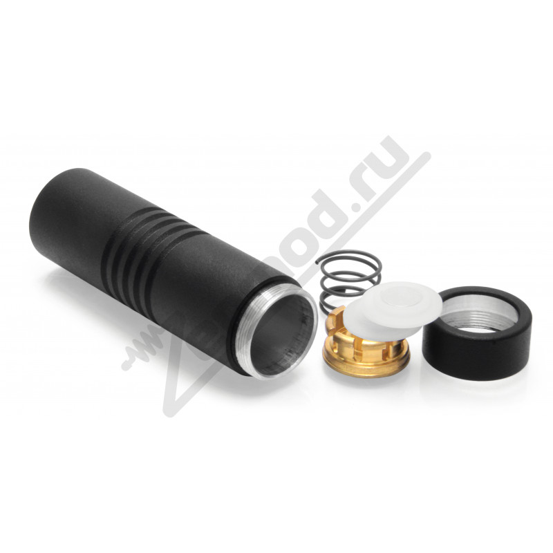 Сердцем мехмода выступает кнопка с постоянным контактом, оснащенная системой “обратной цанги” – лепестки контактируют с корпусом через множество точек, а при нажатии слегка двигаются вдоль тела мода, что предполагает отсутствие “черных точек” на цанге, и по заявлению производителя, элемент не требует чистки.